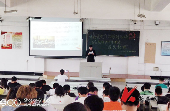 霍婧雅和王浩天两名同学分别从遵义会议召开的历史背景、参会人员、会议内容、会议意义四方面对党史瞬间——遵义会议、党史大事——遵义会议的召开进行了宣讲。王浩天在宣讲中说,遵义会议是中国共产党第一次独立自主地运用马克思列宁主义基本原理解决自己的路线、方针和政策方面问题的会议,是中国共产党和中国工农红军历史上一个伟大的转折点。接着,宣讲团通过对党史人物王稼祥的介绍,带领同学们深入体会遵义会议的伟大精神:实事求是,独立自主,坚定信念,民主团结,务求必胜。最后,与会人员一同观看了影片《遵义会议》,大家重温党史,鉴往知来。