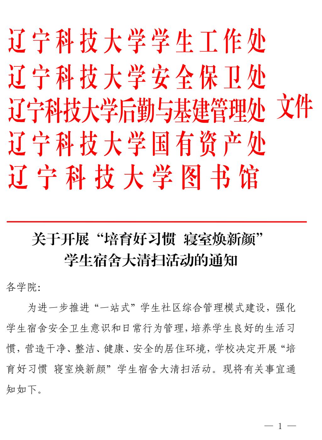 关于开展“培育好习惯 寝室焕新颜”学生宿舍大清扫活动的通知