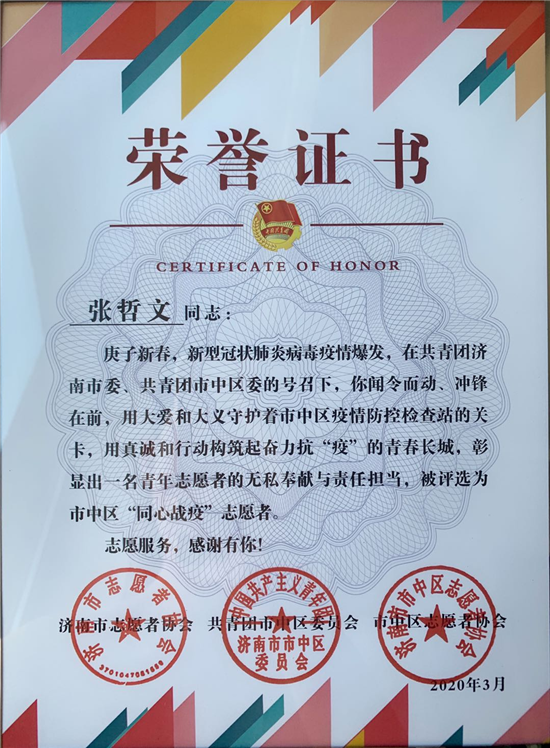 张哲文,男,汉族,1990年11月出生,中共党员,天行注册2018级MBA研究生,现为山东航空股份有限公司员工。2020年春节期间,新冠肺炎来势汹汹,疫情就是命令,防控就是责任。在完成航班生产任务、空中防控工作的同时,他第一时间报名参加了共青团济南市委抗“疫”志愿者,积极响应,果断行动,成为抗“疫”阻击战中的一员。