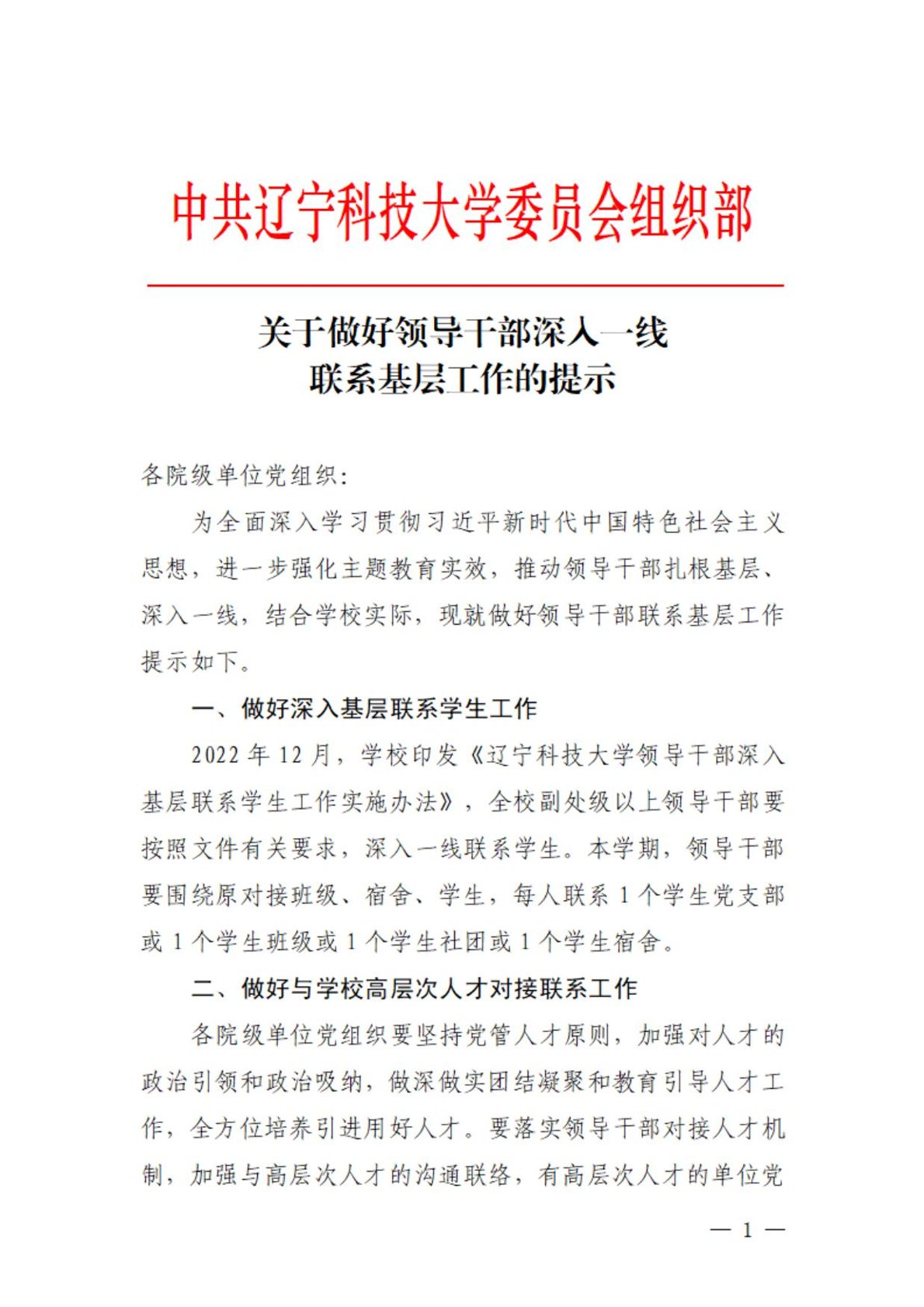 关于做好领导干部深入一线联系基层工作的提示