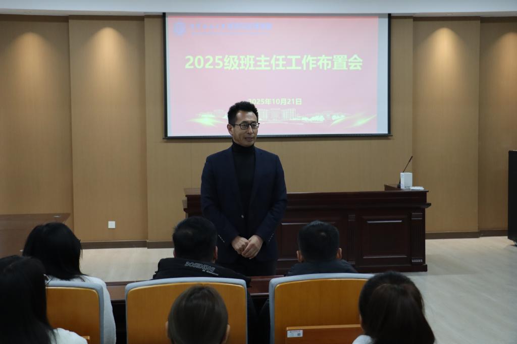 10月21日,经法学院于博识楼A402召开新生班主任与班干部对接会,学院党委书记赵智博、党委副书记张国华、学办主任李路云、8名新生班主任及2025级各班班委代表参加了会议。