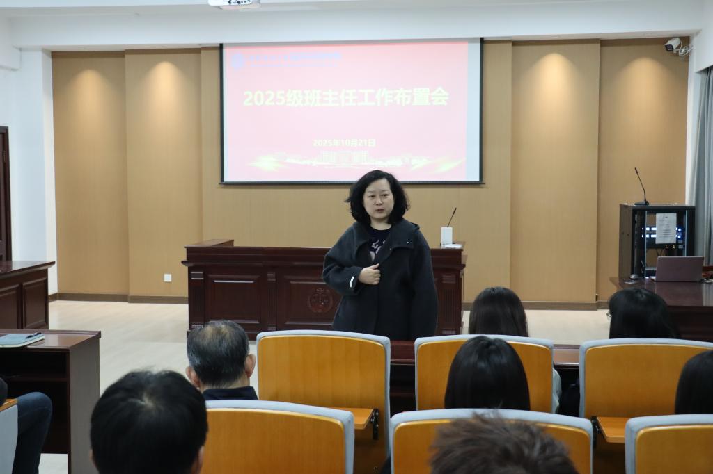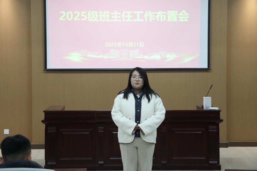会议伊始,赵智博向新生介绍了8名班主任的基本情况,明确班主任核心职责——在思想建设、学业发展等领域为学生提供精准指导,是助力大学生健康成长的“指导者”与“引路人”,对班级学风、班风建设起着关键引领作用。同时,他勉励同学们要主动沟通、勤于请教,尽快适应大学节奏,明确目标方向,在学院这个温暖的大家庭中勇于探索、不断进步。张国华从师生沟通与规划支持、学风建设问题与要求、工作配合与落实三个方面,既指出了当前教学和管理中存在的实际问题,也提出了具体改进措施,强调学生干部要积极配合班主任,共同推动班级建设和学风提升。随后,8位班主任结合各自专业实际情况及学科特色,在学业发展领域为新生开展指导,强调新生要聚焦学习专业知识,努力提升自身技能,养成良好的学习与阅读习惯,树立正确就业观念,以专业所长践行青春担当。最后,学生代表表态,“作为学生干部,我们一定会跟班主任老师打好配合,把班级各项工作做好,共同推进班级学风建设与管理水平不断提高。”