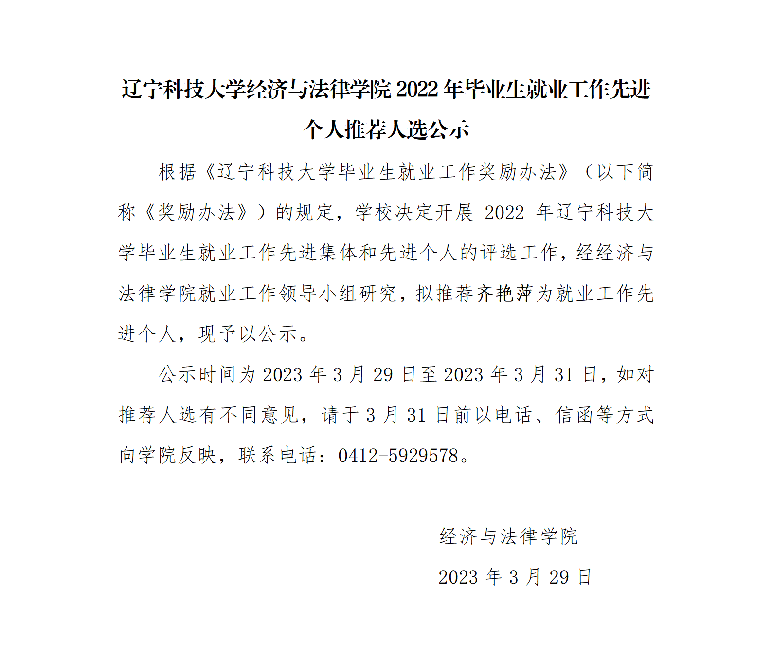 天行注册经济与法律学院2022年毕业生就业工作先进个人推荐人选公示
