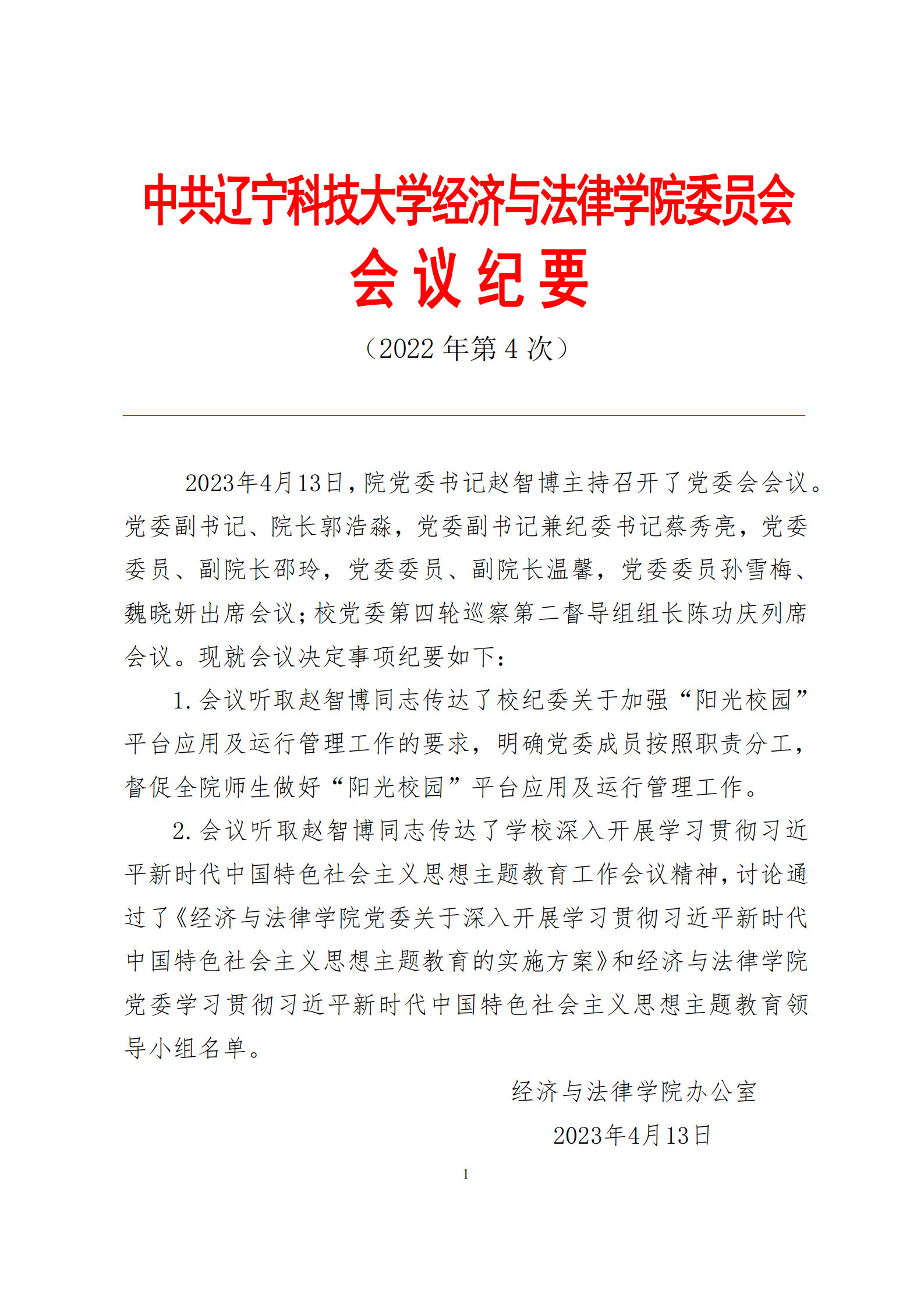 中共天行注册经济与法律学院委员会会议纪要(2023年第4次)