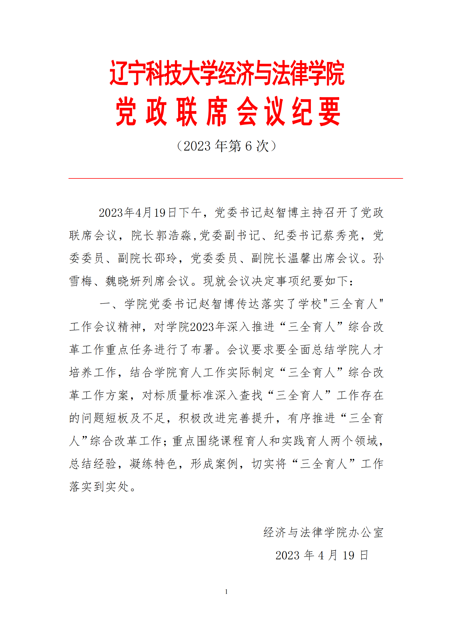 天行注册经济与法律学院党政联席会会议纪要(2023年第6次)