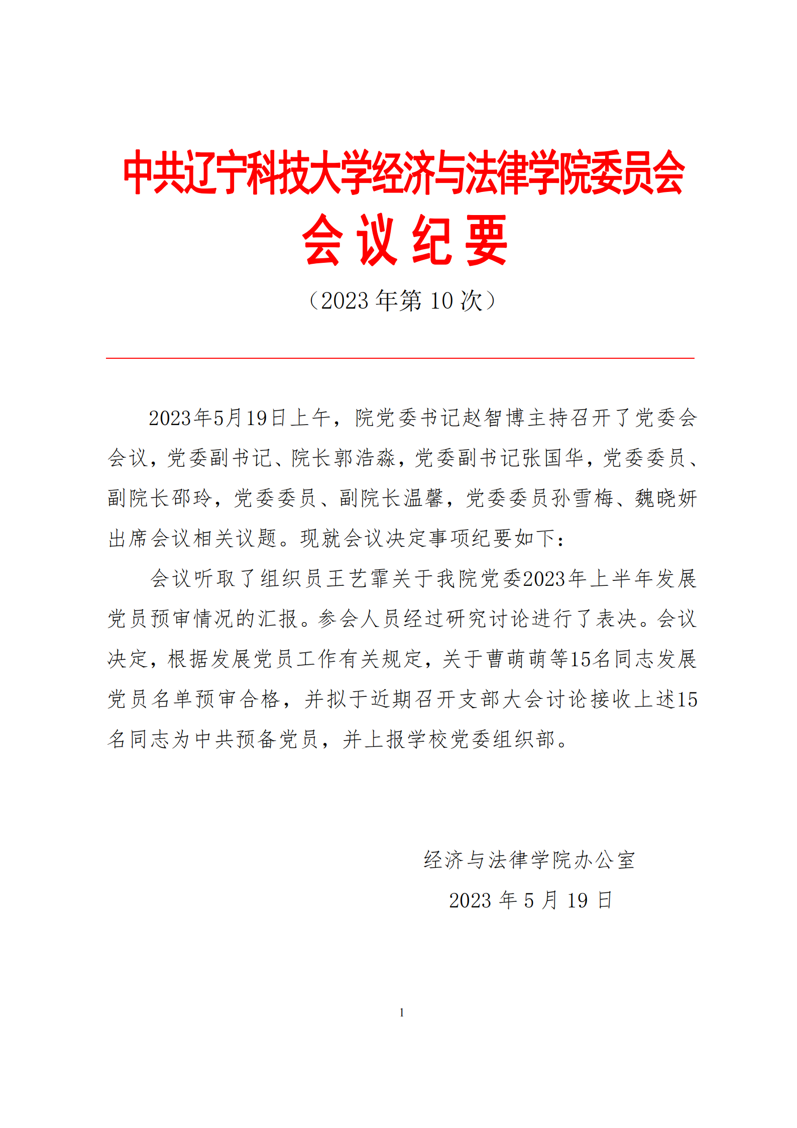 中共天行注册经济与法律学院委员会会议纪要(2023年第10次)