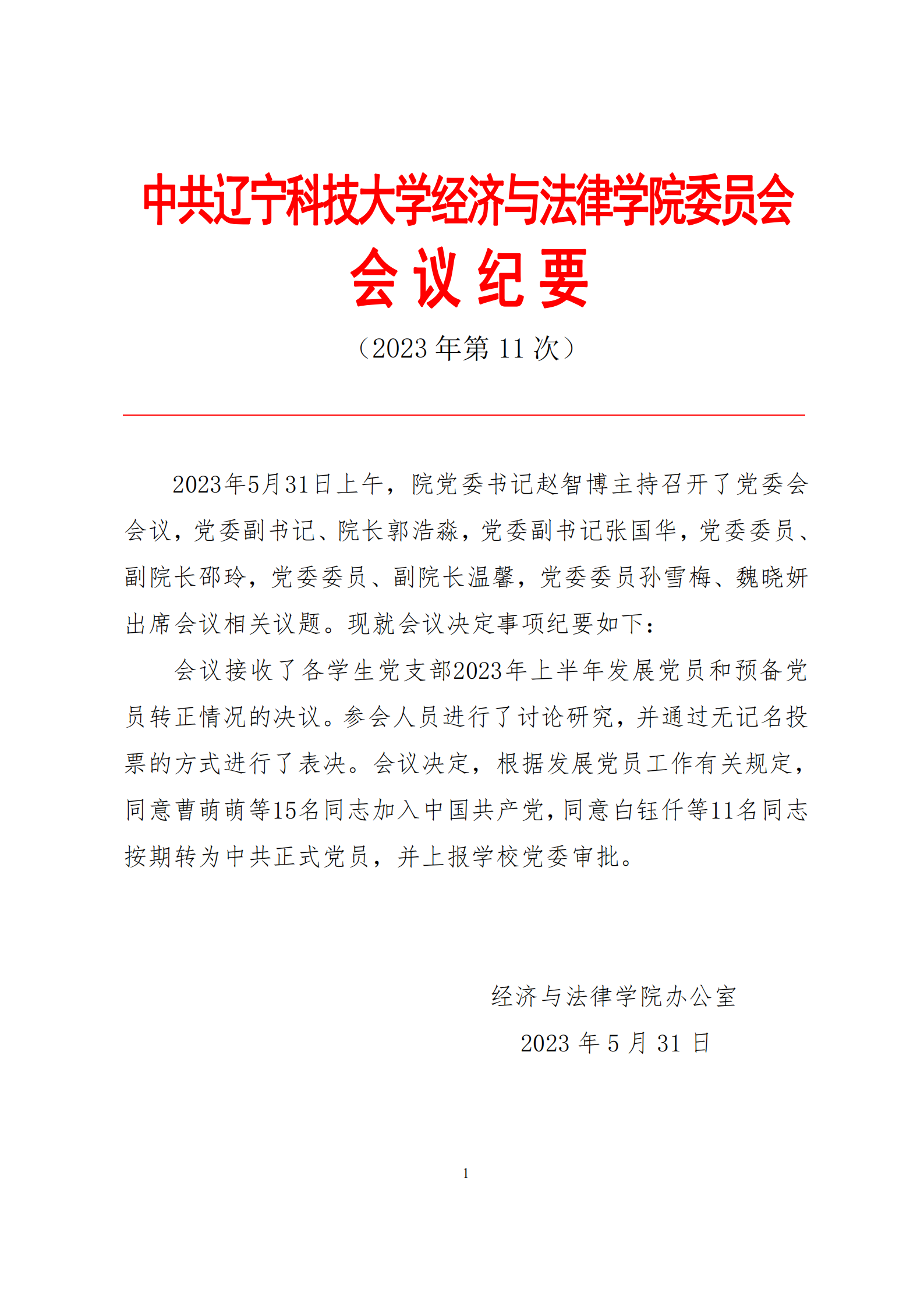 中共天行注册经济与法律学院委员会会议纪要(2023年第11次)
