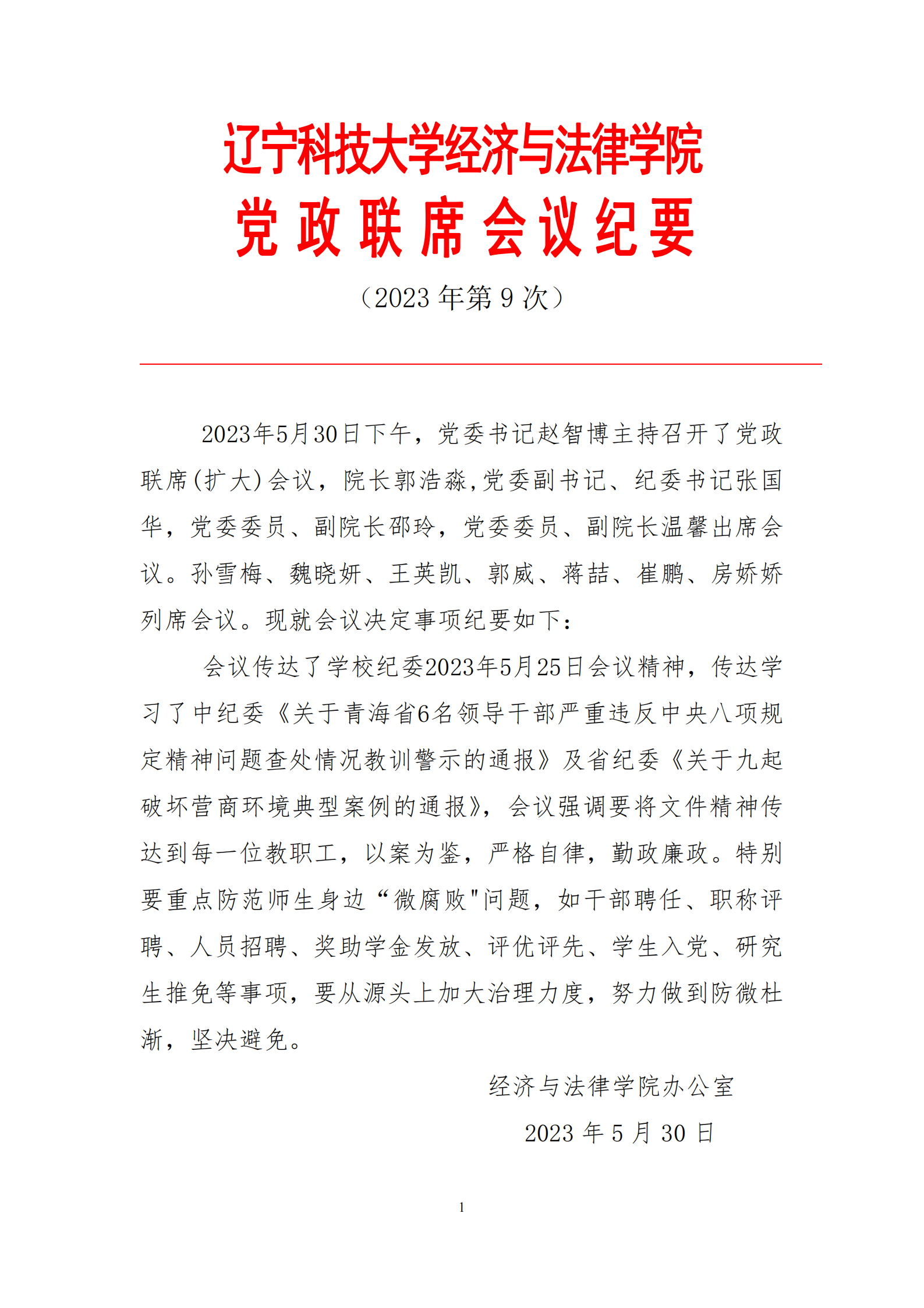 天行注册经济与法律学院党政联席会议纪要(2023年第9次)