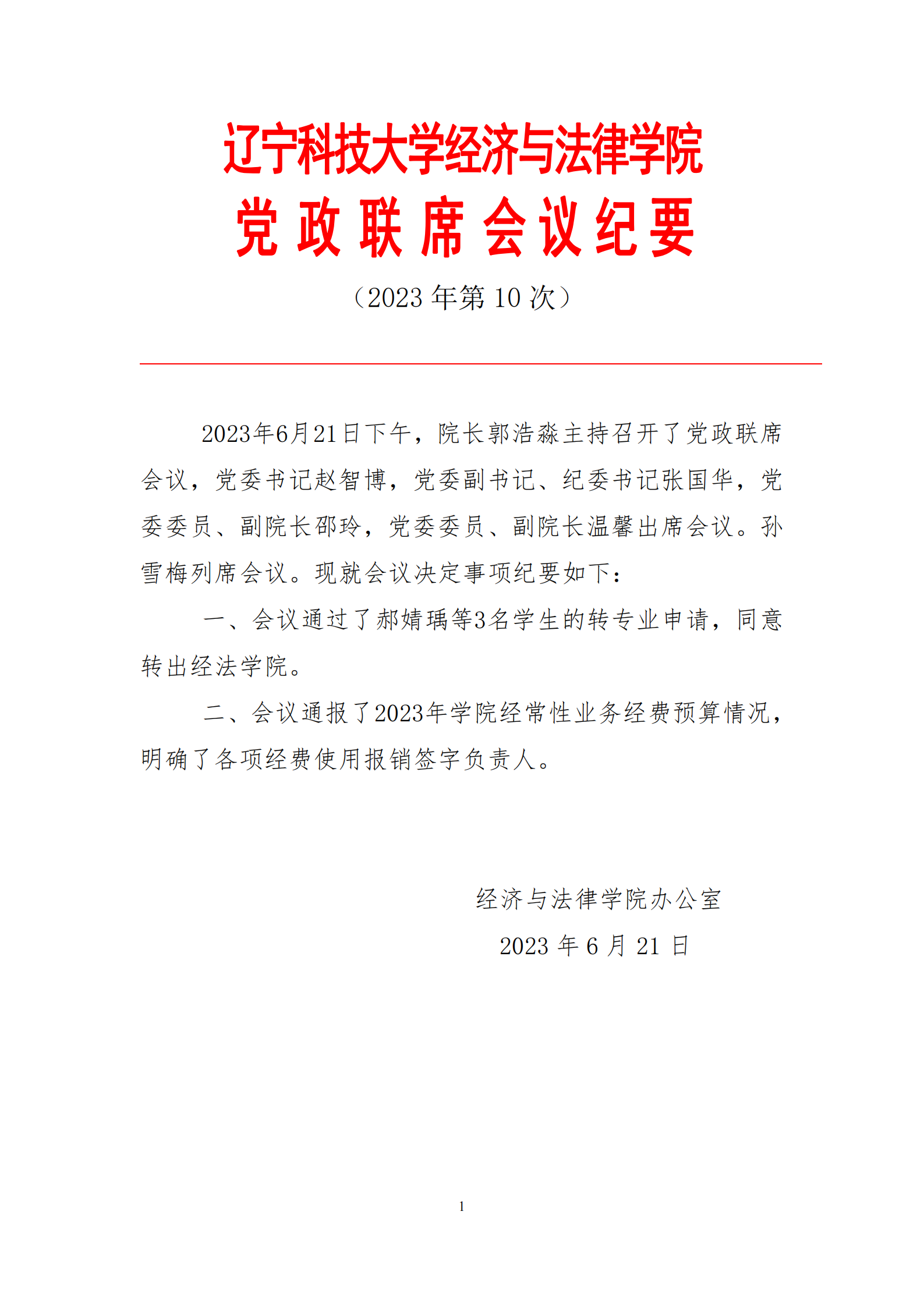天行注册经济与法律学院党政联席会会议纪要(2023年第10次)