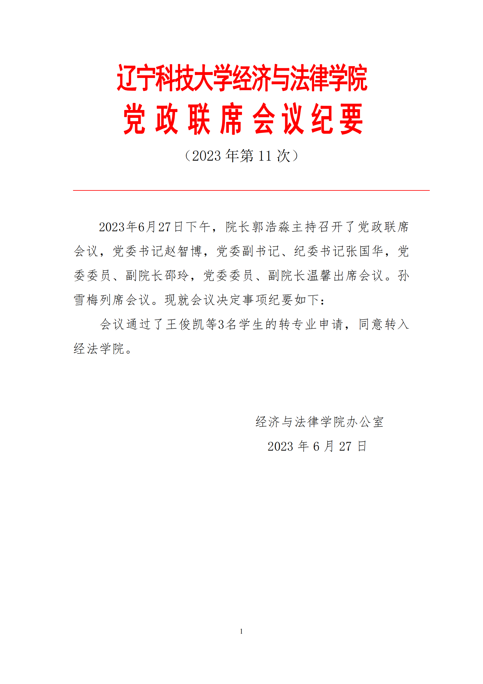 天行注册经济与法律学院党政联席会会议纪要(2023年第11次)