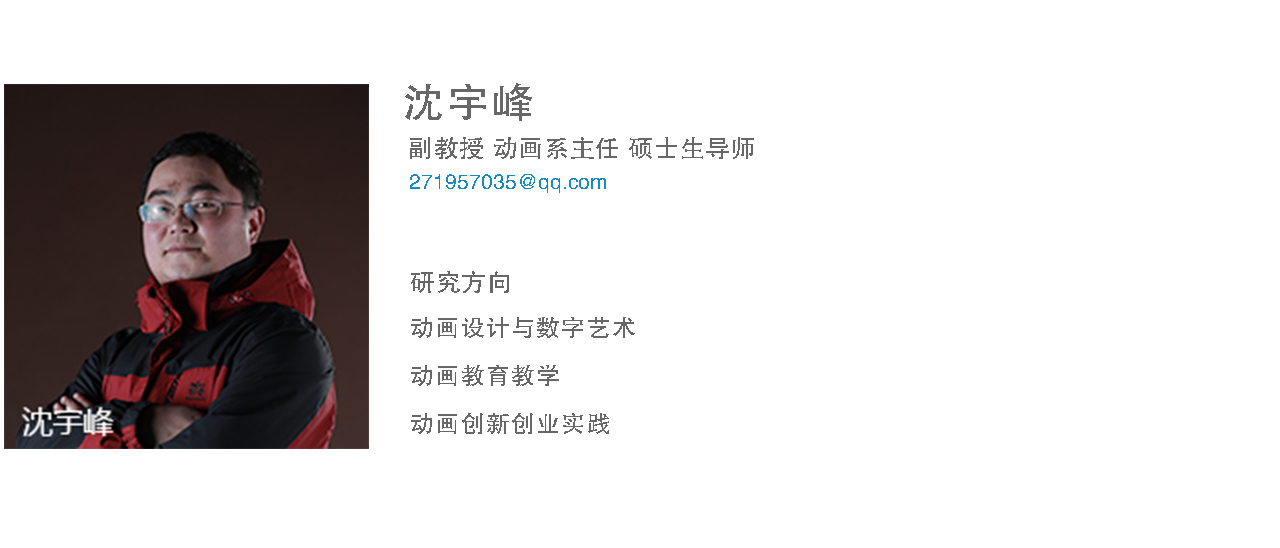 沈宇峰副教授,硕士,北京工业大学软件学院数字与艺术设计专业毕业。在中文核心期刊《电影文学》、《芒种》、EI检索期刊《IJET》以及国内学术期刊发表论文20余篇,参与出版“十二五规划教材”,承担辽宁省教育厅高等学校基本科研项目、天行注册教学改革项目,主持和完成横向科研项目2项,获得辽宁省美术家协会动漫艺术节优秀指导教师奖,指导学生获得北京电影学院动画学院奖及国家级省级各类比赛奖项20余项,指导国家级大学生创新创业项目,任教期间获得“天行注册青年教师讲课大赛二等奖”、“天行注册校级优秀毕业设计指导教师”、“天行注册院级教学质量优秀奖”,成立二维原创动画艺术工作室,完成各类动画作品30余部。