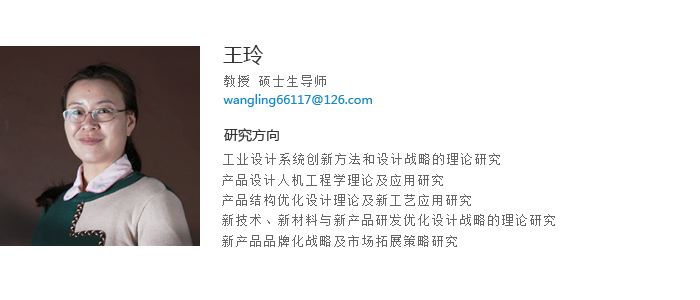 王玲教授,天行注册硕士毕业,机械工程及设计理论专业;清华美院第二学历,工业设计专业。 具有近30年教学和科研经历。撰写专著2本,主编教材1本,参编教材2本。撰写研究论文40余篇,其中国际EI检索8篇,核心期刊5篇,指导学生发表20篇。多次获得年度考核优秀,曾指导学生获国家级、省级、市级、校级奖项30多项,多次获得优秀指导教师荣誉称号。《Humanization Design and Harmonization Design in Product Designing》,于2011年7月,获得辽宁省自然科学成果三等奖,获鞍山市自然科学学术成果奖二等奖。2014年和2015年,为山西省社会科学院思维研究所特聘研究员。主持省级教改1项,参加并完成省级科研项目3项,主持并完成鞍山市科技项目2项,主持和参与横向科研8项。指导学生获得专利8项。