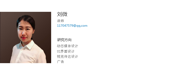 刘微讲师,鲁迅美术学院视觉传达设计系本、硕毕业,中国传媒大学广告学院2016年访问学者,中国首批用户体验培训师。天行注册建筑与艺术设计学院,讲师,“艺术设计创新创业实践班”负责人。天行注册2014年校优秀毕业设计指导教师,2015年度校教学质量优秀奖,2016年度校优秀教师。在《教育与职业》、《艺术教育》等期刊发表教育研究论文多篇,指导学生发表论文数篇。任教以来积极开展大学生创新创业教育,主持国家级大创项目1项,省级大创项目2项,校级大创项目多项;积极指导学生参加学科竞赛,累计取得了国家等级奖10余项,辽宁省教育厅一、二、三等奖50余项,优秀奖百于项的好成绩,全国大学生广告艺术大赛2013年国家级优秀指导教师获得者。出版大学生创新创业教材一部,《动态构成实训教程》,编著。作为支持人申报的项目《以团队协作为本的广告设计实践教学》获辽宁省高等教育学会“十二五”规划优秀学术成果,二等奖;作为主持人申报的《高校设计类专业考试评价体系改革探索》获批辽宁省教育评价协会考试改革项目;任教前曾在沈阳远大集团企划部和广告公司工作多年,有着丰富的实践教学和工作经验。