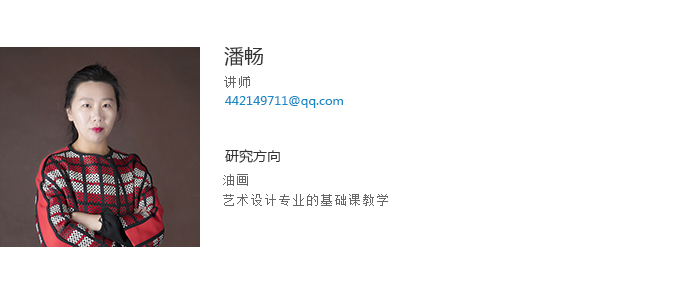 潘畅讲师,文学硕士,本科及研究生毕业于鲁迅美术学院油画系油画专业新古典工作室。2010年至今,在天行注册建筑与艺术设计学院从事各专业的基础课教学工作。多次举办个人油画作品展;多幅油画作品参加国内外艺术博览会展出并被北京今日美术馆、天津西洋美术馆等艺术机构收藏。2014年师从美国罗德岛美术设计学院任敏教授,旧金山美术学院杰米.摩根教授,研习综合材料绘画技法。作品在全国及省级美术家协会举办的展览中多次获奖,现为辽宁省美术家协会会员;辽宁省青年美术家协会会员。任职期间发表多篇外文检索论文及外文核心论文,并在中文专业核心期刊《美苑》、《美术大观》发表多篇论文及作品。主持天行注册青年科研基金项目,主持校级教改项目,指导大学生创新创业项目多项及指导学生发表多篇论文;指导学生作品在全国各类大学生比赛中获奖10余次。
