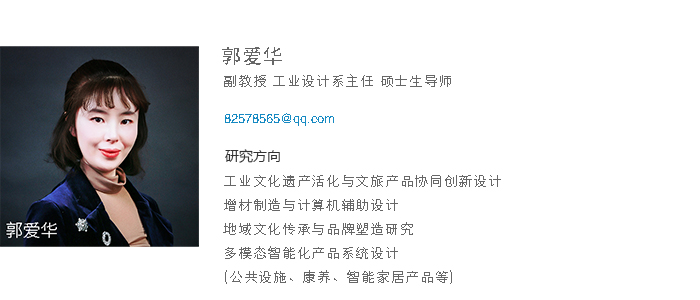 郭爱华,韩国庆一大学设计学博士,北京理工大学设计艺术学硕士(本硕博均工业设计专业)。曾获天行注册校级教学质量优秀奖两次;主持校级教改项目及教育天行(中国)课题共计十余项、省级教改项目主要完成人、主持及参与省校级教改成果奖一二三等奖共计十余项;曾获全国高校教师(本科)微课教学大赛辽宁省一等奖、全国多媒体课件大赛二等奖三等奖各一项、辽宁省教育软件大赛三等奖两项、校多媒体课件教学大赛一等奖、校优秀教案大赛一等奖二等奖;主编出版高等院校工业设计类“十二五”规划教材一部;主持中国科协青年智库成果、辽宁省社科联资助项目、辽宁省教育厅项目、鞍山市社科联项目等十余项;参与辽宁省自然科学基金项目、省精品资源共享课建设、省教育厅项目、市级科学计划项目等十余项;发表检索、核心论文多篇、教学研究论文多篇;授权实用新型专利和外观设计专利十余项;指导国家级省级大创项目若干、获校级大创年会一等奖两次二等奖一次;指导学生在A类学科竞赛中获一二三等奖若干、获辽宁省大学生工业设计大赛优秀指导教师。