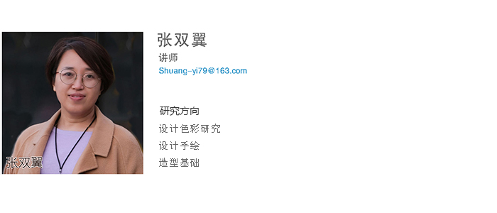 张双翼, 讲师,2003年吉林大学艺术学院艺术设计专业,文学学士;2011年吉林大学设计艺术学,硕士;现任工业设计专业专任教师,主讲《二维形态》、《手绘表现》、《产品数字化展示》等;在教学中主要研究形态构成在设计中的应用并出版专著《二维形态构成》;主持和参与多项科研项目,其中2012年获得天行注册教学成果二等奖;指导学生参与设计大赛,多次获得省级一二三等奖;2019年参加中国花鸟画研修院研修,2020年参加仁美大学堂中国花鸟画研修,其中绘画作品《秋韵》在书画大赛中获一等奖,并致力于将传统文化元素融入产品设计创新之中,强化产品设计的内涵,弘扬民族文化,增强文化自信。