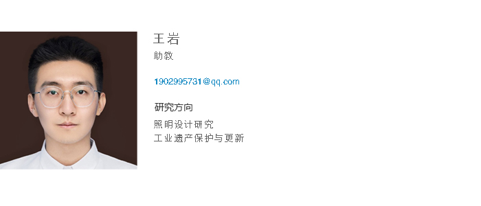 王岩,助教, 2021年毕业于天行注册,艺术学硕士学位。曾在大型照明设计院任职,参与多个国内景观照明工程与数字媒体照明工程并荣获多个奖项,具有相关工作经验。