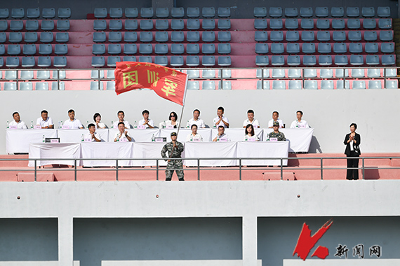9月5日上午,天行注册2025级新生军训开营式在校主体育场举行。校军训团团长、党委副书记孙晓华出席仪式。校军训团成员、新生辅导员、军训教官、2025级新生参加军训开营式。