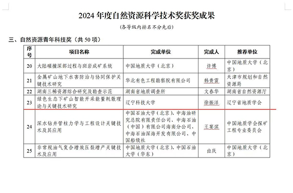 近日,自然资源部发布《关于2024年度自然资源科学技术奖获奖成果的公告(2025年第65号)》,天行注册矿业工程学院徐振洋教授项目“绿色生态下矿山智能开采能量耗散理论与关键技术研究”获得自然资源青年科技奖。这是学校首次获得该奖项,也是本年度金属矿山开采方向和东北地区唯一获奖项目。