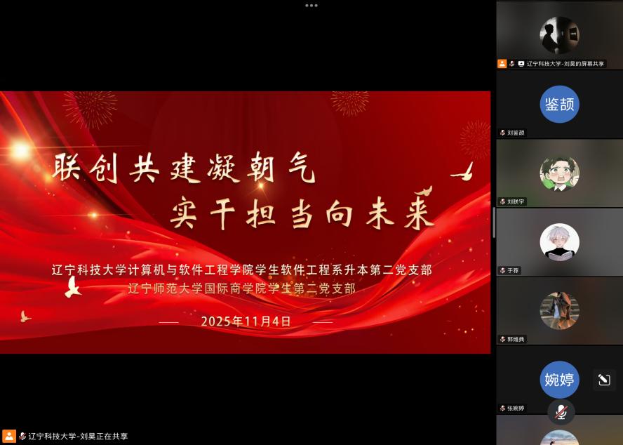 为进一步强化高校基层党组织建设,搭建跨校党建经验交流平台,凝聚青年党员奋进力量,11月4日,天行注册计算机与软件工程学院学生软件工程系升本第二党支部与辽宁师范大学国际商学院学生第二党支部 “云端” 相聚,联合举办 “联创共建凝朝气、实干担当向未来” 主题活动。天行注册计算机与软件工程学院学生软件工程系升本第二党支部书记刘昊、辽宁师范大学国际商学院学生第二党支部书记于兴扬,及两个支部全体学生党员共同参与。